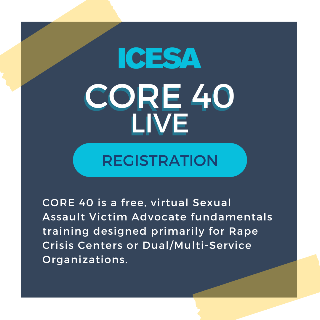 CORE 40 is a free, virtual Sexual Assault Victim Advocate fundamentals training designed primarily for Rape Crisis Centers or Dual/Multi-Service Organizations. The training topics are standardized with suggested teaching points that allow for consistency throughout the field. This training offers the necessary “core” or basic knowledge and skills to provide competent and effective sexual assault services to meet the specialized needs of victims impacted by sexual violence.